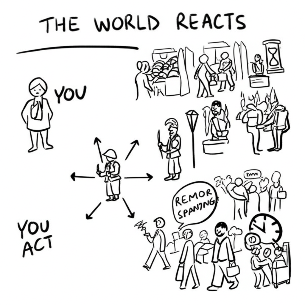 - The world doesn't pause. Between my messages, NPCs act and consequences develop.
